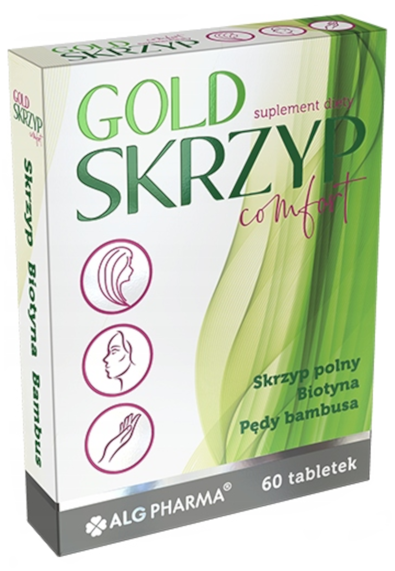 Suplement diety Alg Pharma GOLD Skrzyp Comfort to produkt, opracowany w celu wsparcia zdrowia i kondycji skóry, włosów oraz paznokci. Zawiera starannie dobraną kombinację składników, w tym ekstrakt z ziela skrzypu polnego, sproszkowane pędy bambusa oraz biotynę.