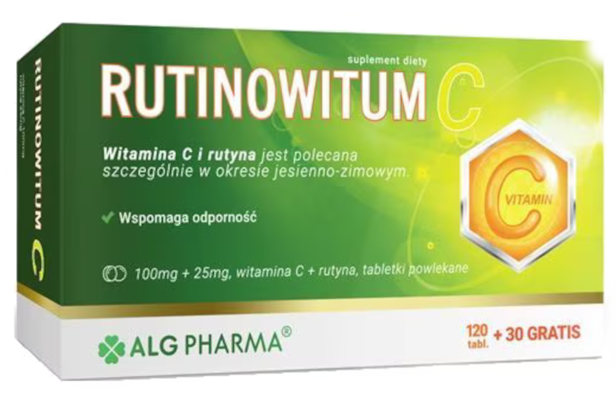 Suplement diety Alg Pharma Rutinowitum C to produkt w postaci tabletek, zawierający połączenie witaminy C i rutyny. Produkt został stworzony w celu wsparcia ogólnego zdrowia i dobrej kondycji organizmu. Ma na celu uzupełnienie codziennego zapotrzebowania organizmu na witaminę C i rutynę.