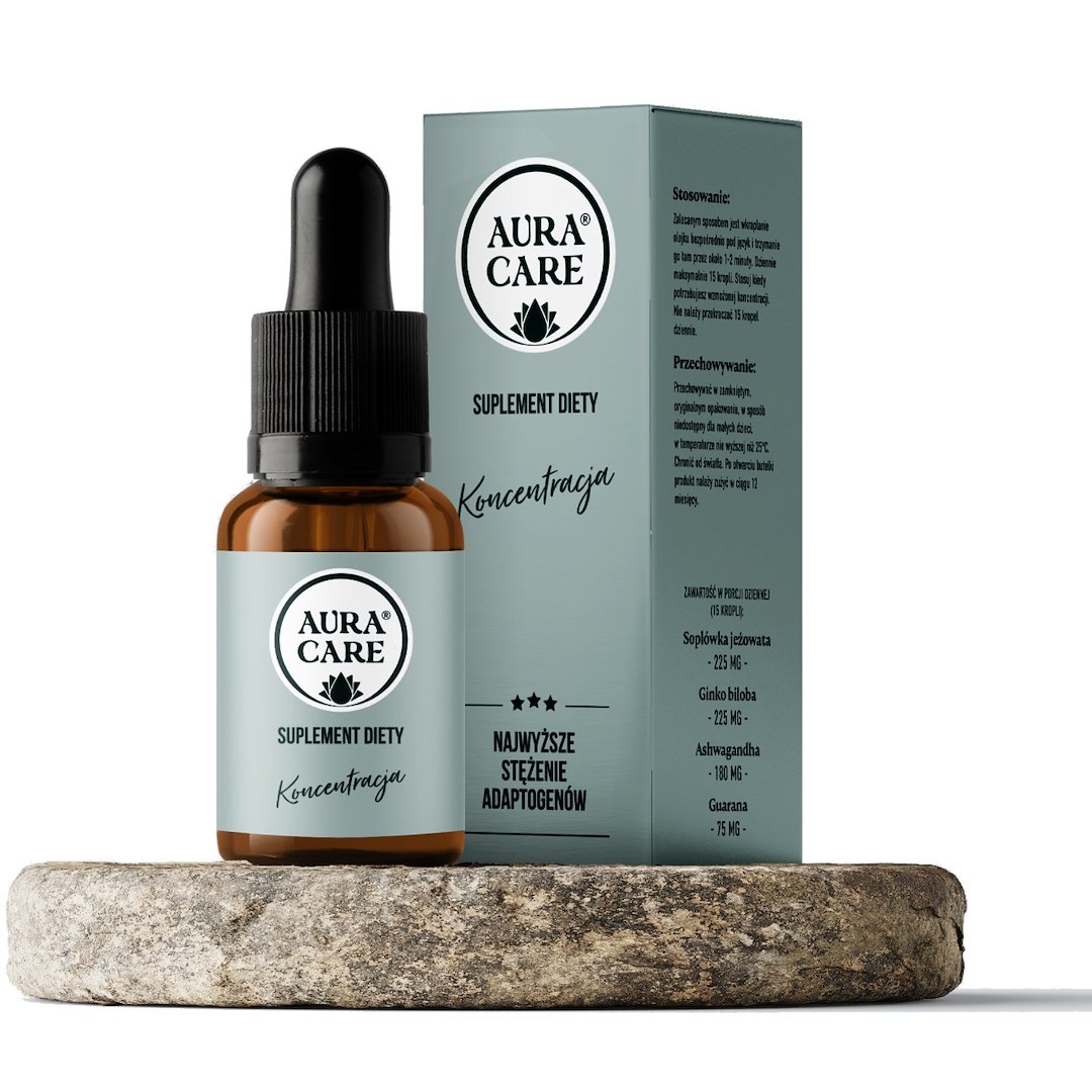 Aura Care Koncentracja Adaptogeny 15 ml to suplement diety zaprojektowany z myślą o naturalnym wsparcia koncentracji i pamięci. Produkt w formie kropli, zawierający 15 ml w każdym opakowaniu, jest wzbogacony o starannie dobraną mieszankę adaptogenów, takich jak ekstrakty z soplówki jeżowatej oraz miłorzębu japońskiego.