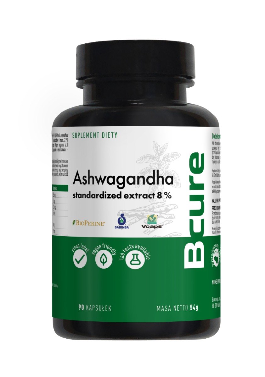 Suplement diety BCure Ashwagandha, został stworzony w oparciu o składniki aktywne: ekstrakt z korzenia witanii ospałej oraz ekstrakt z owoców pieprzu czarnego, pochodzące z renomowanej firmy Sabinsa Corporation. Firma ta to lider w produkcji ekstraktów roślinnych i składników funkcjonalnych. Gwarantuje pełną standaryzację ekstraktu z ashwagandhy na zawartość: witanolidów, witaferyny oraz alkaloidów, co zapewnia najwyższą jakość produktu.