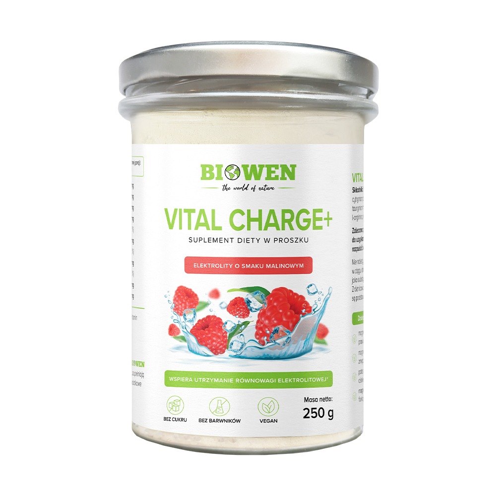 Biowen Elektrolity Vital Charge+ proszek 250 g smak malinowym jest specjalnie formulowanym suplementem diety, który wspomaga równowagę elektrolitową organizmu, szczególnie podczas intensywnego wysiłku fizycznego lub wysokich temperatur. Produkt jest stworzony z myślą o zapewnieniu natychmiastowego uzupełnienia ważnych elektrolitów, takich jak sód, potas i magnez.