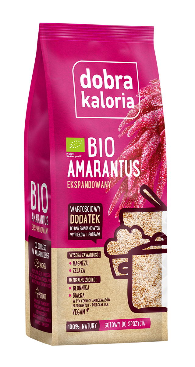 Dobra Kaloria BIO Amarantus ekspandowany to wysokiej jakości, w pełni naturalny i polski produkt, który zawiera ekspandowane ziarna amarantusa. Zboże to jest skarbnicą wielu substancji aktywnych o korzystnym wpływie na zdrowie człowieka.