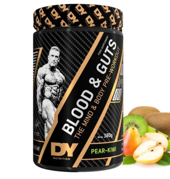 Suplement diety Dorian Yates Blood and Guts Pre-Workout to wysokiej jakości produkt, który przeznaczony jest do stosowania przed treningiem. Zawiera niezwykłą mieszaninę substancji aktywnych, takich jak aminokwasy – cytrulina, beta-alanina, arginina AKG, tyrozyna, witaminy – niacyna oraz ekstrakty roślinne z zielonej herbaty, pieprzu czarnego i guarany. Ma wygodną do stosowania postać proszku o pysznym smaku gruszki i kiwi.
