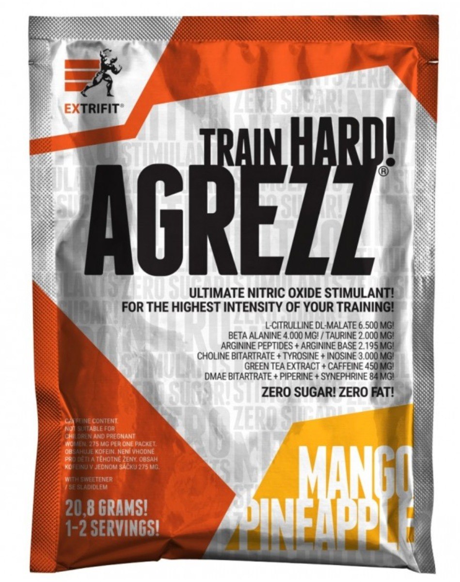 Extrifit Agrezz 20,8g o smaku ananas-mango to idealny suplement diety dla entuzjastów sportów siłowych, którym zależy na poprawie wyników treningowych i uzyskaniu pompy mięśniowej. Można znaleźć w nim szereg wyjątkowych składników, włączając w to aminokwasy (np. tyrozyna, arginina, l-cytrulina), ekstrakt z zielonej herbaty, kofeinę, taurynę oraz cholinę i piperynę.