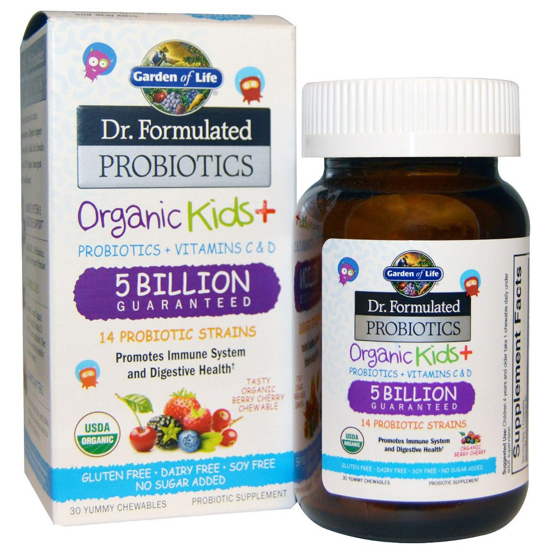 Suplement diety Garden of Life Dr. Formulated Probiotics Organic Kids+ zawiera potężną mieszankę probiotyków, witaminy D i witaminy C. Ten świetnie smakujący suplement występuje w wygodnej formie 30 tabletek o smaku jagodowym i wiśniowym i jest odpowiedni dla dzieci w wieku 4 lat lub starszych.