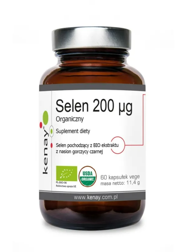 Suplement diety Kenay Selen organiczny 200 µg 60 kapsułek to wysokiej jakości produkt, który dostarcza wysokiej jakości selenu. Pierwiastek ten pochodzi z BIO ekstraktu z nasion gorczycy czarnej, dzięki czemu jest bardzo dobrze przyswajalny przez organizm. Preparat ma czysty i bezpieczny skład.
