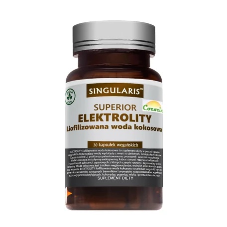 Suplement diety Singularis Elektrolity Liofilizowana woda kokosowa to wysokiej jakości produkt, który powstał w wyniku liofilizacji niedojrzałych kokosów (Cocos nucifera L.). Substancja ta jest źródłem wielu cennych składników, witamin, minerałów i elektrolitów. Zaletą preparatu od Singularis jest prosty, bezpieczny skład oraz możliwości stosowania przez wegan i wegetarian.